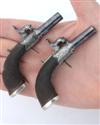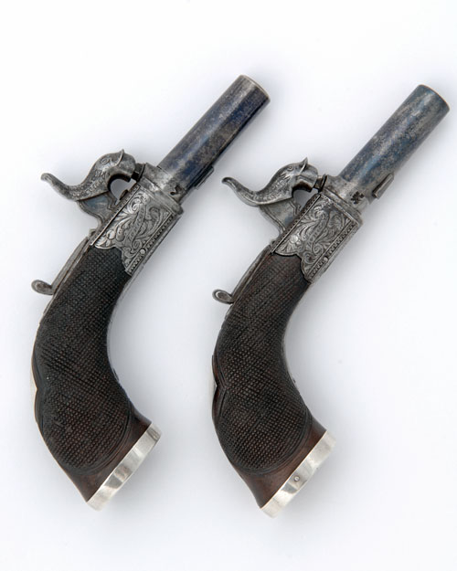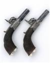 circa 1840, with 1 1/4in blued micro-rifled turn-off barrels, foliate and border engraved side panels signed 'CLARKE', the opposite 'LONDON', dolphin engraved central hammers, sliding safes on the tangs, finely chequered walnut pistol-grips with diamond-shaped silver escutcheons to the backs, silver oval escutcheons and banding to the bases, concealed triggers, Birmingham proofs, each pistol measuring under 4in in length (actions brushed bright, much original colour on the remainder)