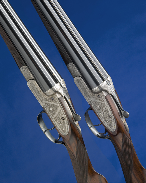 28in. nitro reproved barrels, the ribs gold-inlaid '1' and '2' at the breech ends, (wall thicknesses below recommended minimum), 2 3/4in. chambers (No.1) 2 1/2in. chambers (No.2), bored approx. true cyl. and 1/2 choke (No.1) true cyl. and 1/4 choke, treble-grip actions, automatic safeties with gold-inlaid 'SAFE' details, removable striker discs, border and scroll engraving, retaining very slight traces of original colour-hardening and finish, 14 7/8in. stocks with engraved steel heel and toe plates, weight 6lb. 1oz. (No.1) 5lb. 15oz. (No.2), in their brass-cornered leather double guncase