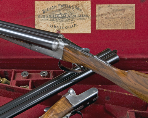 30in. nitro barrels (No.1 nitro reproved, wall thicknesses just below recommended minimum), the ribs engraved 'WILLIAM POWELL & SON, 35 CARR'S LANE, BIRMINGHAM.' (No.1 rib engraving indistinct), 2 1/2in. chambers, bored approx. 1/4 and 3/4 choke (both), treble-grip actions, automatic safeties with inlaid 'SAFE' detail, border engraving, brushed bright and reblued finish, 14 1/2in. figured stocks including 1/2in. ebonite extensions, No.1 with escutcheon engraved 'H.C.W.V. JUNE 7TH 1902 PRESENTED BY THE CLAYDON TENANTRY', No.2 with knot at hand, weight 6lb. 10oz. (No.1) 6lb. 11oz. (No.2), in their brass-cornered leather double guncase.
