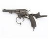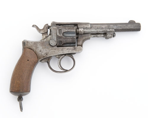 circa 1890, with 4 1/2in octagonal, sighted barrel, top of frame signed 'I. HOLLIS & SONS, LONDON', hinged side-plate accessible by lowering trigger guard, swiveling gate, captive spring-loaded ejector-rod on r/h side of barrel, wooden grips (one replaced), lanyard ring to base (traces of finish, mild pitting at muzzle, London and Liege proofs)