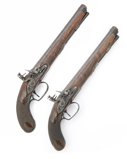 A PAIR OF 30-BORE FLINTLOCK DUELLING PISTOLS,