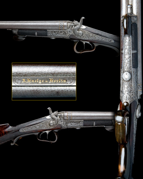 27 1/4in. nitro reproved fine etched damascus barrels (in 2010, slightly shortened), rib carved in relief and gold-inlaid 'A. HAETGE. IN BERLIN.' in a stippled cartouche, the breech ends deeply carved with oak leaves and acorns and with two gold bands, 2 1/2in. chambers, open chokes, forward-facing underlever slide-and-tilt action (of Collath type) fully self-cocking hammers, deeply carved percussion fences with oak-leaf engraved flutes, recessed bosses, rebounding back-action locks, elongated top-strap, carved horn triggerguard with integral pistolgrip (chip to pistolgrip), the whole carved in relief with woodland scenes of capercaillie, fox and partridge, pointer and hare and a nye of pheasants, surrounded and invaded by scrolling oak leaf and acorn motifs, all on a matt background, 13 7/8in. very highly-figured stock with sculpted cheekpiece, engraved sling stud and engraved steel heel and toe plates, weight 6lb. 8oz.