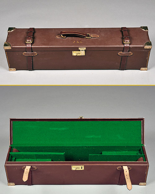 to accept 28in. barrels (would adapt to 29in.), green baize interior with some accessories, straps and handle extant, the exterior impressed with the monogram 'J.A.C.'
