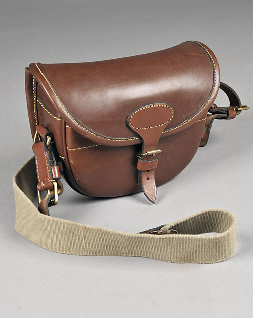 for approx. 75 cartridges and impressed 'Purdey' to underbody, plain oval free of monogram, heavy canvas shoulder strap and speed-loading lid.