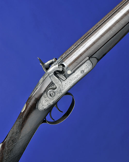 circa 1840, with 30in re-browned barrels (small areas of external pitting), the centre-rib engraved 'TURNEY LONDON' (refreshed) and scrolls to the breech-end, platinum lines and plugs, flat border engraved bar-action locks with makers signature and scrolls, fan tails, dolphin hammers, walnut half-stock re-chequered at the wrist, silver oval to top of wrist, iron furniture, long-spurred heel-plate with areas of engraving and original ramrod (iron parts brushed bright and re-finished)