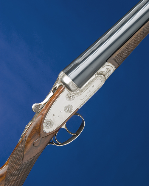 26 3/4in. (68cm.) nitro chopperlump barrels with narrow rib, 2 3/4in. chambers, bored approx. imp. cyl. and 3/4 choke, manual safety, removable striker discs, cocking indicators, articulated front trigger, rolled-edge triggerguard, border and partial scroll engraving, bright finish, 15in. figured stock, weight 6lb. 15oz.