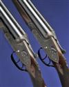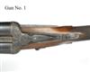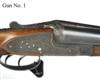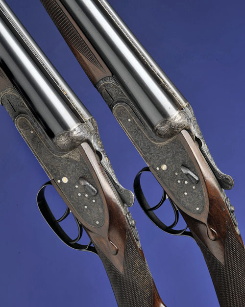 26in. nitro chopperlump barrels, the ribs gold-inlaid '1' and '2' at the breech ends, 2 3/4in. chambers, bored approx. imp. cyl. and 3/4 choke (both), treble-grip actions with sideclips, toplevers gold-inlaid '1' and '2', automatic safeties, hand-detachable sidelocks, gold-inlaid cocking-indicators, articulated front triggers, rolled-edge triggerguards, profusely engraved with foliate scrollwork, retaining much original colour-hardening and finish, 14 1/2in. stocks, weight 6lb. 11oz. (No.1) 6lb. 10oz. (No.2), in a leather double guncase