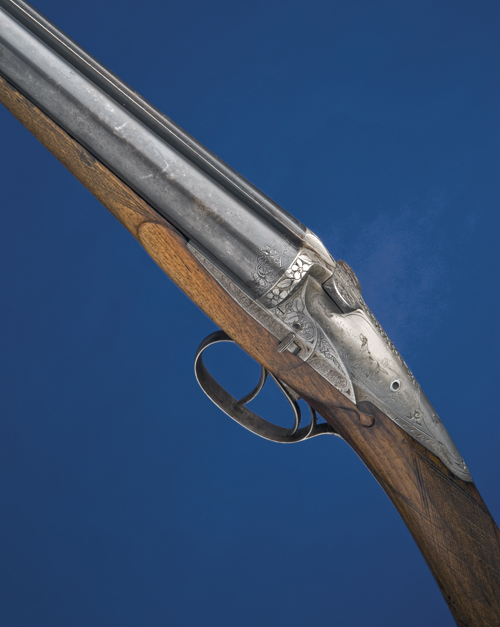 27 1/4in. nitro barrels with matt rib, flats signed 'SOLEILHAC PERE & FILS', 2 1/2in. chambers, bored approx. 3/4 and full choke, manual sliding breech with protruding concentrically orbiculated bosses, manual side safety switch with gold-inlaid 'SUR' detail, floral and foliate engraving surrounding vignettes of hounds on point, bright finish, 13 3/4in. stock including buttplate, sling swivels, weight 6lb. 3oz.
