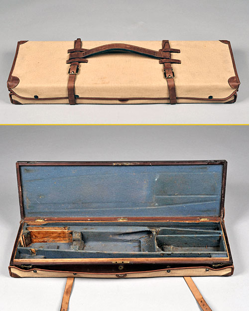 to accept 28in. barrels (would adapt to 30in.), re-fitted internally in blue baize (moderate mothing and patching), full-length case extension to increase depth, plain escutcheon, moderate setting crack to lid, the whole in a later canvas and leather outer showing light wear only.