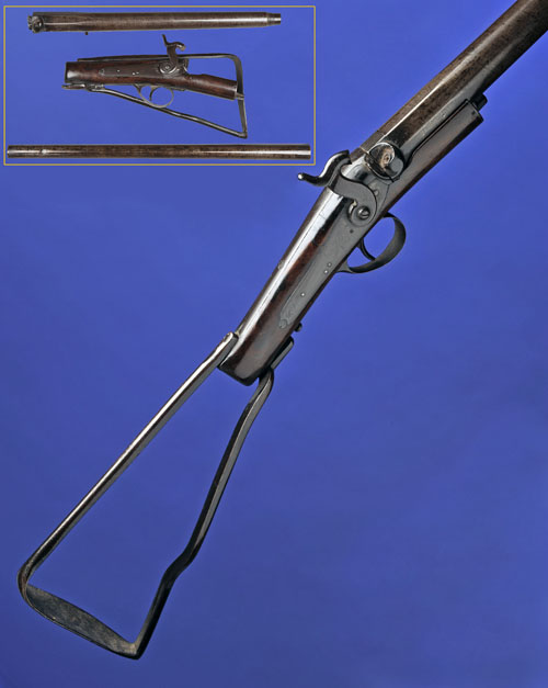 early Victorian, with round, tapering two-part 32 1/4in barrel (divides on a thread 14 1/2in from the breech), back-action border-lined lock with scroll engraving, flat-sided dolphin hammer (nipple broken off), short figured walnut quarter-stock with full length scroll engraved top-tang, iron folding skeleton butt with release catch on bottom tang, nose plate with quick release barrel catch, the whole dismantling into three sections for stowage (iron parts discoloured and stained, wood with some age cracking).