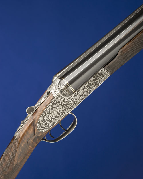 32 1/8in. nitro barrels with raised matt rib, the tubes gold-inlaid with two bands at the breech end, 89mm chambers, bored approx. extra full choke in both, manual safety with gold-inlaid 'SAFE' detail, removable striker discs, rolled-edge triggerguard, action, lockplates and furniture carved with bold arabesques on a matt background, the underside gold-inlaid with the makers details, beavertail fore-end, 16 1/2in. well-figured stock including 1in. recoil pad, weight 10lb. 9oz., in a universal case