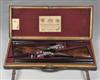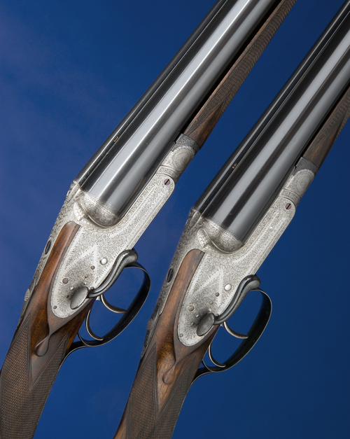 28in. replacement nitro barrels, the ribs engraved 'STEPHEN GRANT & SONS. 67A ST JAMES'S STREET. LONDON.' and gold-inlaid '1' and '2' at the breech-ends, 2 1/2in. chambers, bored approx. 1/4 and 1/2 choke (No.1) imp. cyl. and 1/2 choke (No.2), sidelever actions with fluted fences, removable striker discs, automatic safeties with gold-inlaid 'SAFE' details, best fine acanthus scroll engraving, brushed bright and reblued finish, 14 1/2in. figured replacement stocks, weight 6lb. 11oz. (No.1) 6lb. 9oz. (No.2), in their brass-cornered oak and leather double guncase