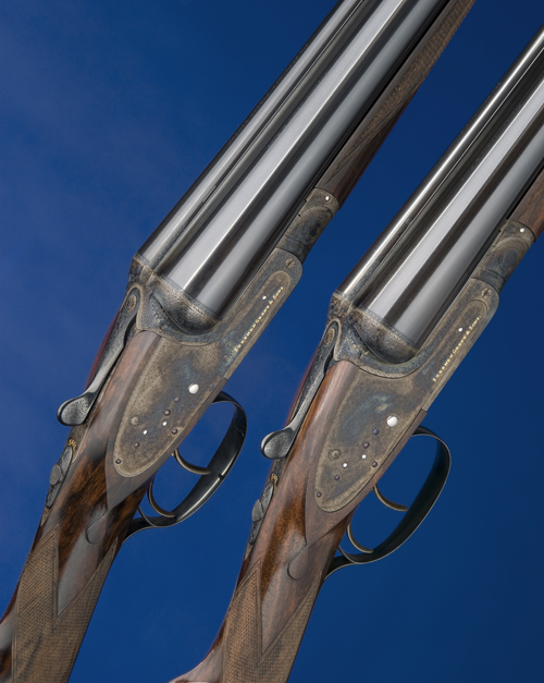 30in. replacement nitro chopperlump barrels (by the makers in 2006), ribs engraved '1' and '2' and with scroll details at the breech ends, tubes engraved 'STEPHEN GRANT & SONS. 67A ST. JAMES'S STREET. LONDON.', 2 3/4in. chambers, bored approx. 1/4 and full choke, fluted fences, automatic safeties with gold-inlaid 'SAFE' details, striker discs, best fine acanthus scroll engraving, the lockplates inlaid in gold with the makers name, triggerguard tangs gold-inlaid with the serial numbers, retaining virtually full renewed colour-hardening and finish, 15 1/2in. highly-figured replacement stocks with matching fore-end woods, weight 7lb. 3oz., in a new best lightweight leather motor case with canvas outer