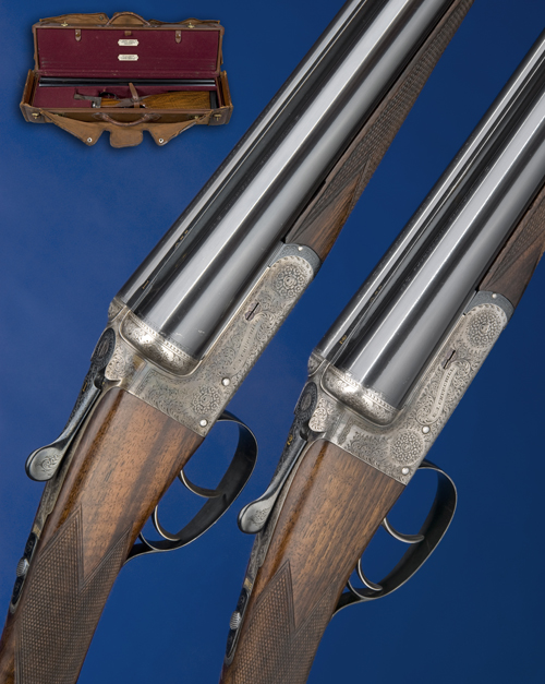 25in. nitro barrels with matt Churchill ribs gold-inlaid 'XXV' and '1' and '2', the tubes engraved 'E.J. CHURCHILL (GUNMAKERS) LTD. ORANGE ST. GUNWORKS. LEICESTER SQUARE. LONDON.', 2 1/2in. chambers, slender fences, treble-grip actions, the toplevers gold-inlaid '1' and '2', automatic safeties with gold-inlaid 'SAFE' details, fine bouquet and scroll engraving, the undersides engraved 'UTILITY XXV EASY OPENING MODEL' with 'XXV' gold-inlaid, retaining some original colour-hardening and finish, 15in. figured stocks (swept at the comb), weight 6lb. 4oz. (No.1) 6lb. 2oz. (No.2), in their leather 'the V.C.' double motorcase with canvas and leather outer