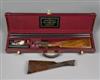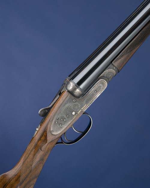 28in. nitro chopperlump barrels, rib gold-inlaid 'JOHN WILKES' and engraved '79, BEAK STREET, LONDON, W.1.', 2 3/4in. chambers, bored approx. imp. cyl. and 1/2 choke, automatic safety with gold-inlaid 'SAFE' detail, Holland & Holland style self-opening system, gold-inlaid cocking indicators, rolled-edge triggerguard, best bouquet and scroll engraving, the makers name gold-inlaid on the lockplates and the underside, retaining virtually full original colour-hardening and some finish, 15 7/8in. highly-figured replacement stock including 3/4in. leather covered recoil pad, weight 7lb. 1oz., in its lightweight leather case, together with its original approx. 14in. highly-figured stock. The gun was completed circa 1992