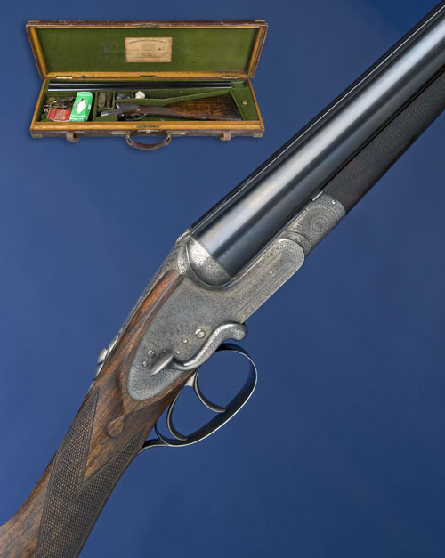 28in. replacement nitro chopperlump barrels, tubes engraved 'STEPHEN GRANT & SONS. 7. BURY STREET. ST. JAMES'S. LONDON.', 2 1/2in. chambers, bored approx. true cyl. and 1/2 choke, carved fluted fences, sidelever, automatic safety with gold-inlaid 'SAFE' detail, fine acanthus scroll engraving, retaining traces of colour-hardening, 15in. well-figured replacement stock (together with its original approx. 15in. stock including buttplate, slight crack at head), weight 6lb. 8oz., in its brass-cornered oak and leather case.