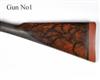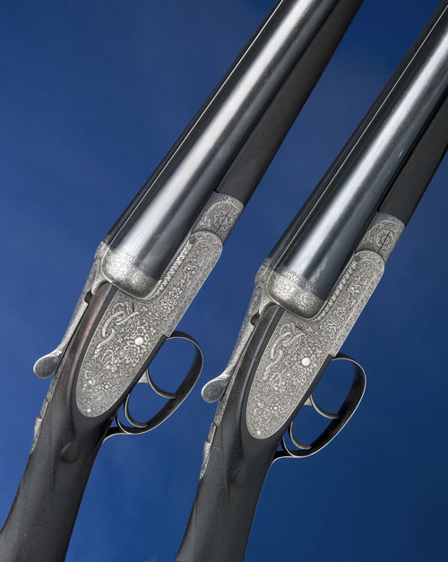 27 5/8in. nitro chopperlump barrels (No.2 reproved in 2010) with raised ribs (No.2 matt), 2 3/4in. chambers, bored approx. 1/4 and 3/4 choke, treble-grip actions, toplevers gold-inlaid '1' and '2', patent gas checks, removable striker discs, automatic safeties, articulated front triggers, profuse engraving of floral and acanthus scroll motifs, the undersides with vignettes of alighting mallard in wetland settings, silver finish overall, 15in. highly-figured stocks including 1in. rubber recoil pads, fore-end woods with light damage to edges and insert repair to No.1, weight 7lb. 1oz.