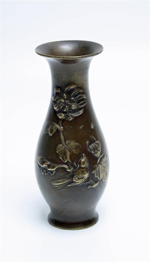 A CHINESE BRONZE VASE, early 20th century, with flared mouth and embossed with raised birds and foliage (lightly worn)