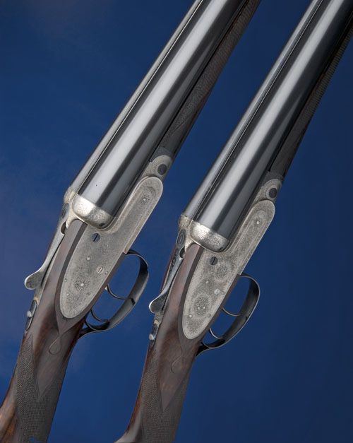 29 1/2in. nitro chopperlump barrels (No.1 nitro reproved), ribs engraved 'J. PURDEY & SONS. AUDLEY HOUSE. SOUTH AUDLEY STREET. LONDON. MADE OF SIR JOSEPH WHITWORTH'S FLUID PRESSED STEEL', 2 3/4in. chambers (No.1) and 2 1/2in. chambers (No.2), bored approx. imp. cyl. and 1/2 choke, automatic safeties with gold-inlaid 'SAFE' details, removable striker discs, cocking-indicators, No.2 with arrows, best fine bouquet and scroll engraving, retaining very slight traces of original colour-hardening, 14 1/2in. well-figured replacement stocks, slightly cast on, No.1 fore-end wood with two insert repairs, fore-end woods inlaid in silver '1' and '2', weight 6lb. 12oz., in a brass-cornered oak and leather case with some accessories