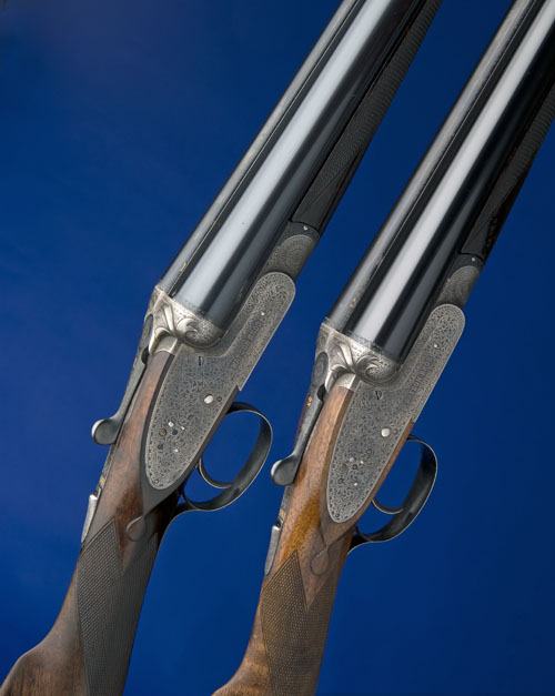 30in. nitro chopperlump barrels, ribs engraved 'WATSON BROS. 29, OLD BOND STREET, LONDON.', and gold-inlaid '1' and '2', No.1 with nitro reproved barrels with 2 1/2in. chambers, bored approx. true cyl. and 3/4 choke, right wall thickness just below recommended minimum, No.2 with replacement barrels by the makers in 2008, 2 3/4in. chambers, bored approx. 1/4 and 1/2 choke, treble-grip actions, fences carved in relief with stylised acanthus leaves, toplevers gold-inlaid '1' and '2', automatic safeties with gold-inlaid 'SAFE' details, non-selective single-triggers, best bold acanthus scroll engraving, the undersides engraved 'WATSON BROS PATENT ONE TRIGGER', retaining traces of original colour-hardening (No.1) and slight traces of original colour-hardening (No.2), 15in. highly-figured stocks (No.2 a replacement) including 1in. leather-covered recoil pads, weight 7lb. 3oz. (No.1) and 7lb. (No.2), in a universal case