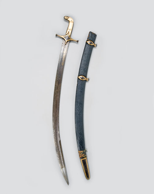 circa 1750, with 32 1/2in curved blade (patinated), widening and double-edged for the last 10in, twin narrow fullers to both sides, inlaid arabic inscription in gold to the right hand side near the hilt, signature also gold inlaid, possibly reading 'AHERWOLEK' to the back edge, the iron hilt of Persian form fully decorated in gold koftgari-work (minor losses, some pitting to exposed iron surfaces), ivory scales (some shrinkage), TOGETHER WITH its original scabbard of blackened animal skin over wood with raised scroll decoration (some worm, minor losses), two iron suspension bands decorated en-suite with the hilt together with a similar decorated nose-cap (old string-bound repair near tip of scabbard)