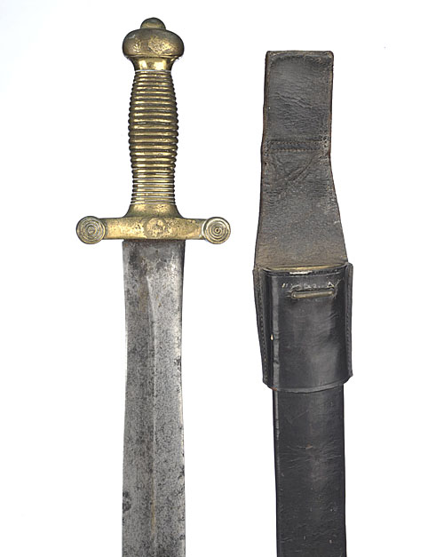 circa 1840, with 'gladius' style 19in blade (stained with some pitting) signed 'COULAUX', cast brass unmarked hilt of usual form, TOGETHER WITH its matching black leather scabbard with brass mounts and correct leather frog