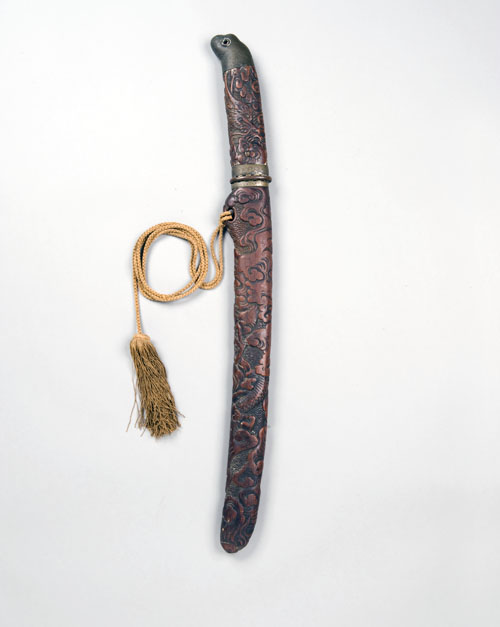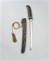 probably early to mid 18th century, with narrow 16in shortened blade, unsigned tang, silver 'habaki' engraved with diagonal lines and carved with Japanese characters in relief to the top and bottom edge, copper oval 'tsuba', the whole re-mounted in a late Edo period carved wood scabbard and hilt with brass mounts
