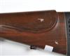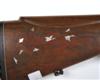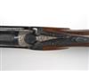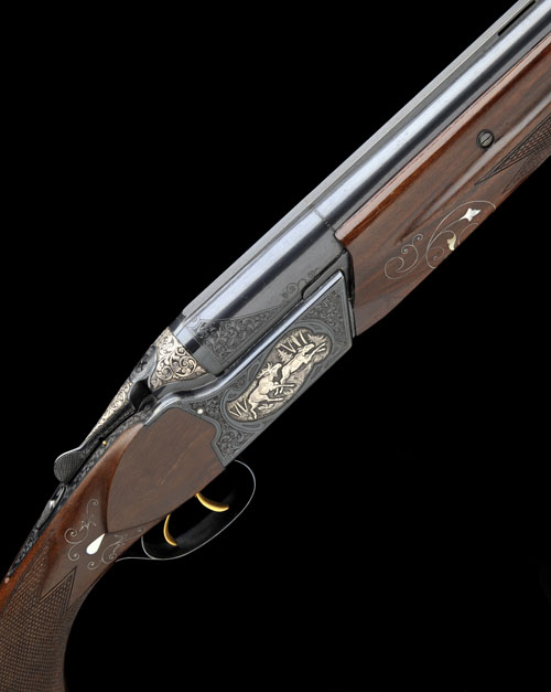 28in. nitro reproved barrels (in 2010) with 7mm ventilated matt top-rib and permanently attached fore-end, 2 3/4in. chambers, bored approx. 3/4 and full choke, hold-open toplever, cocking indicators, manual safety, gold-washed triggers, the blacked action carved in relief with acanthus scrollwork on a matt background surrounding vignettes of running stag and doe in wooded landscapes with a bright polished finish, the top fence and toplever carved in relief with acanthus scrollwork on a matt background in a bright polished finish, 14 3/4in. pistolgrip stock including 1in. ventilated rubber recoil pad, with raised cheekpiece inlaid with scrolling wire and a solitary mother of pearl mallard in flight, the stock and fore-end inlaid with scrolling wire with mother of pearl leaves and game birds, and mother of pearl inlaid drop points, weight 6lb. 13oz.