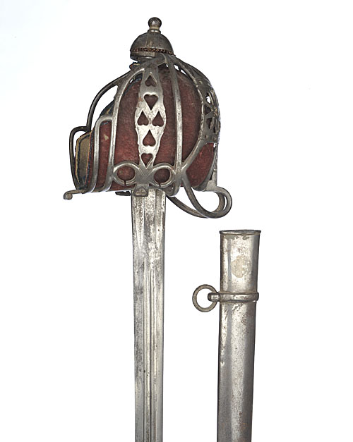 circa WW1, with 33 1/2in twin fullered double edged spearpoint blade (traces of etching), dismountable steel basket of standard form with red felt and chamois leather lining (faded with losses), shark-skin grip with wire binding (staining and discolouration throughout), TOGETHER WITH its original nickel-plated dress scabbard (losses to plating)