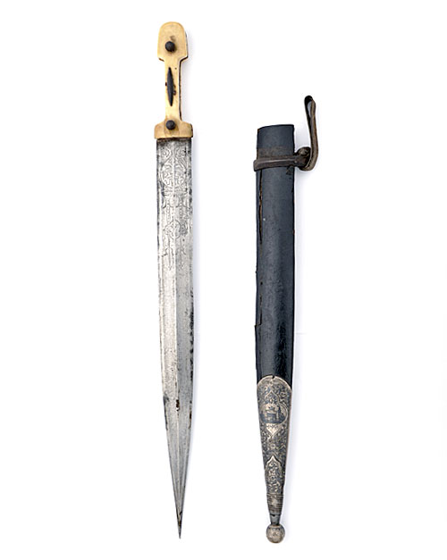 dated for 1898, 16 1/4in spire-point blade with central medial ridge, the front etched with a balloon shaped panel containing a Russian two-headed eagle surrounded by scrolls and surmounted by spires with the date in a panel between, the reverse side of blade etched with a panel containing an unidentified inscription together with another in cyrillic translating as 'ZACCHARIAH', hilt of standard form with ivory scales (discoloured with minor losses) secured by two iron spherical headed, spirally fluted rivets and a central iron bar similarly decorated, TOGETHER WITH its original leather-bound scabbard with silver chape, nielloed with vines and a citadel (Mecca?) with a further unidentified inscription beneath, terminating in a ball finial (losses to leather covering, finial re-attached)