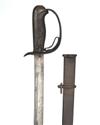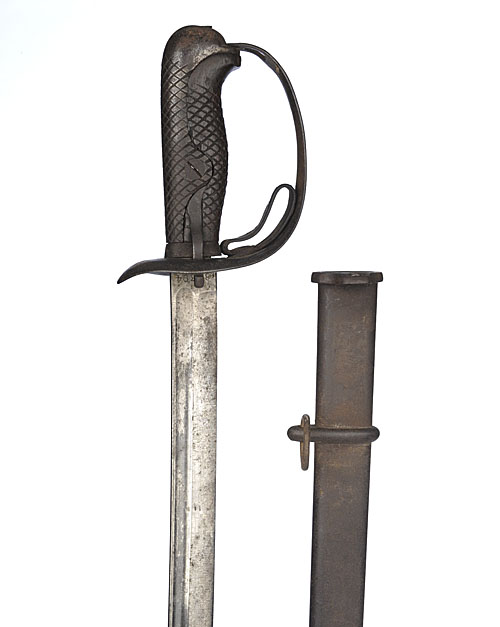A JAPANESE 'KYU-GUNTO' MOUNTED INFANTRY SWORD, early 20th century, with slightly curved 32 3/4in arsenal produced fullered blade of Japanese style numbered '83394' at the forte (patches of discolouration and mild pitting), steel rolled-edge stirrup guard with leather finger-loop and scabbard release catch, heavy, coarsely chequered steel back-strap with similarly chequered wooden fore-grip (light surface corrosion, TOGETHER WITH its original steel scabbard (corroded)