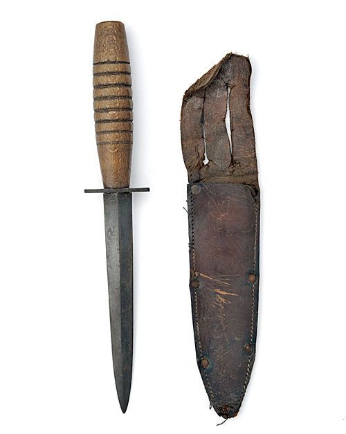 circa 1944, with 6 5/8in (slightly shortened and re-profiled) blackened double-edged stiletto blade signed 'JOHN BLYDE, CLINTOCK WORKS, SHEFFIELD' (feint) together with a 'ringed-planet' trademark, wooden hilt, swollen to the center with eight grooves and countersunk nut to pommel (split near cross-guard), TOGETHER WITH its original leather sheath in distressed condition.
