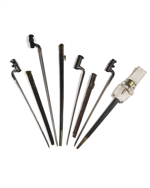 the first for a musket circa 1840 with provision for the 'Hanoverian' catch, 15 1/2in triangular blade (worn), socket marked '2' over '31' with its brown leather scabbard (chape missing), the second for a 'Pattern 53' rifle, 17in triangular blade, the elbow marked 'HB', the locket and scabbard frog stud marked 'LD2 468' (bayonet heavily cleaned, scabbard with chape missing), the third in fine order for the same rifle marked 'VB s 8. 41' in the same locations, complete with a 'Slade Wallace' pattern frog, the last for a 'Martini-Henry', with a 21 3/4in triangular blade also in fine order with minimal losses to finish, matching scabbard with light losses to leather.