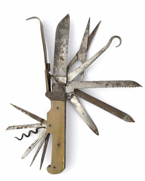 A GOOD EARLY 19TH CENTURY COACHMANS KNIFE WITH THIRTEEN FUNCTIONS