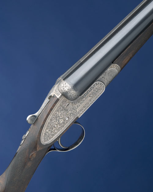 30in. nitro barrels with broad raised matt rib, tubes engraved 'WILLIAM EVANS. MAKER TO H.R.H. THE DUKE OF CONNAUGHT. 63, PALL MALL, ST. JAMES'S. LONDON.', 2 7/8in. chambers, bored approx. extra full choke in both, treble-grip action with removable striker discs, automatic safety with gold-inlaid 'SAFE' detail, non-selective single trigger, the action, lockplates and furniture deeply carved with acanthus scrollwork and foliage, the underside engraved 'EVANS PATENT SINGLE TRIGGER', retaining traces of original colour-hardening, 14 7/8in. well-figured stock with diamond grip and engraved steel heel and toe plates, weight 8lb. 2oz.