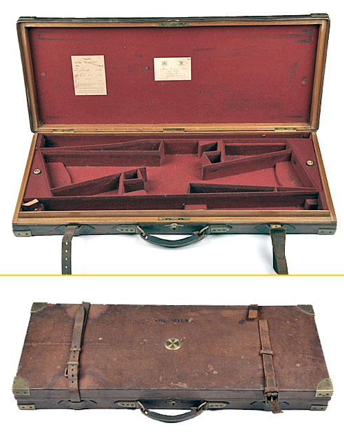 James Purdey Audley House London label, fitted for 30 1/2in barrels, lined with maroon baize, lid impressed with COL. MILNE