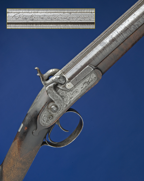 for 1825, converted from flintlock circa 1840, with 29in twist steel browned barrels, top rib signed in script 'JOHN MANTON AND SON DOVER STREET', platinum vents, scroll engraved breech ends and top-tang, flat lockplates signed 'JOHN MANTON AND SON PATENT' with engraved borders, foliate panels and a pheasant, scroll engraved dolphin head hammers, birds-eye maple half-stock with chequered wrist, steel long-eared scroll engraved heel-plate, steel trigger guard engraved en-suite with the locks, pineapple finial and ramrod throat, silver barrel-wedge escutcheons and brass-mounted ramrod with tool end (traces of original finish throughout), TOGETHER WITH a period brass cornered oak, compartmented case (some loose) lined in green baize, trade label in lid for 'WILLIAM & JOHN RIGBY, DUBLIN with provision for flask and other accessories, the end compartment containing a period pin punch
