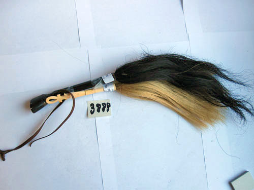 A HORSE TAIL WHISK WITH BONE HANDLE IN THE SHAPE OF A HORSE LEG,
