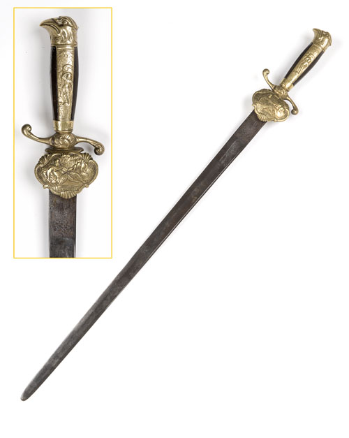 circa 1780, with 25in single edged blade (slight loss to tip), false edged for the last 7in, single wide fuller with back-edge groove, the fuller engraved with a naïve hound chasing a boar on the left hand side and a stag on the right, the ricasso etched with knot-work, musical and martial trophies, running vine engraved on the blade spine, large brass rococco shell guard with an eagle and a recumbant male in 17th century dress holding a scroll, 'S' shaped guard with relief decoration, brass-mounted hilt with a relief carved grip panel containing a man in armour, eagle head pommel (fixing hole for chain knuckle bow, missing), and renewed (in antiquity) leather grip, (blade with discolouration, brass-work polished with some loss to detail, no scabbard)