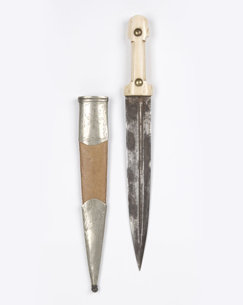 late 19th/ early 20th century with 10in double-edged spearpoint blade (darkly stained with patches of corrosion), single asymetric fullers on each side, ivory hilt of classic form with two brass rivet heads TOGETHER WITH its original scabbard with lightly engraved white-metal mounts and pale leather body (renewed)