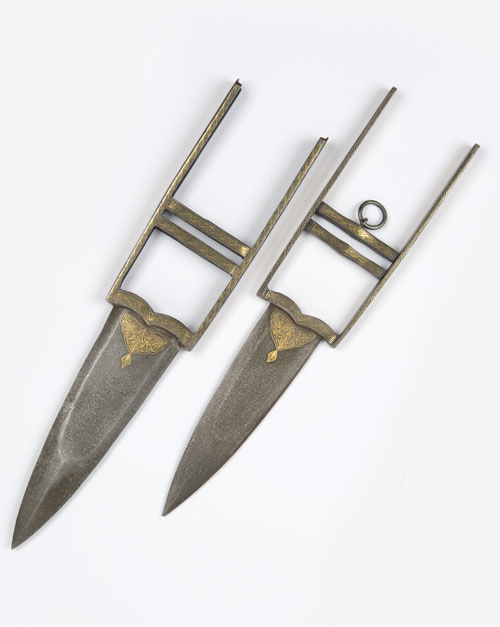 20th century with 7 1/4in double-edged spearpoint blade, swelling at the tip, of etched rose damascus with a panel of gold damascening at the base, the twin barred grip of plain iron covered in further panels of gold damascening and geometric inlays TOGETHER WITH its rose damascus katar-shaped sliding sheath copying the dagger in its form and decoration