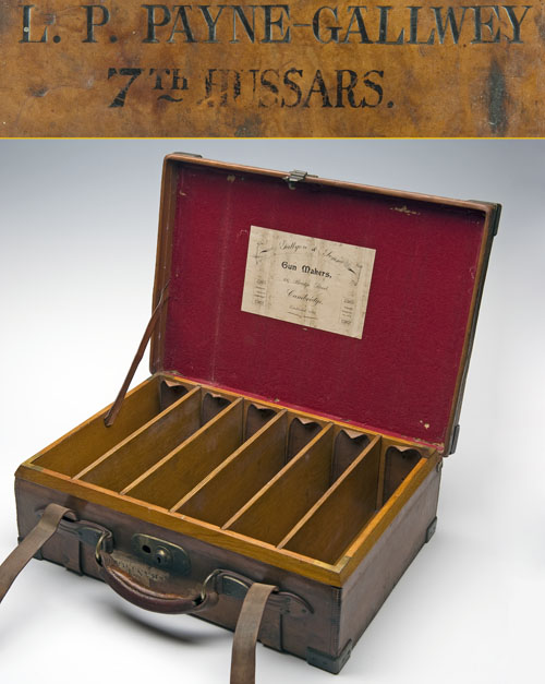 A BRASS-CORNERED OAK-LINED LEATHER CARTRIDGE MAGAZINE, THE LID MARKED 'L.P. PAYNE-GALLWEY 7TH HUSSARS',