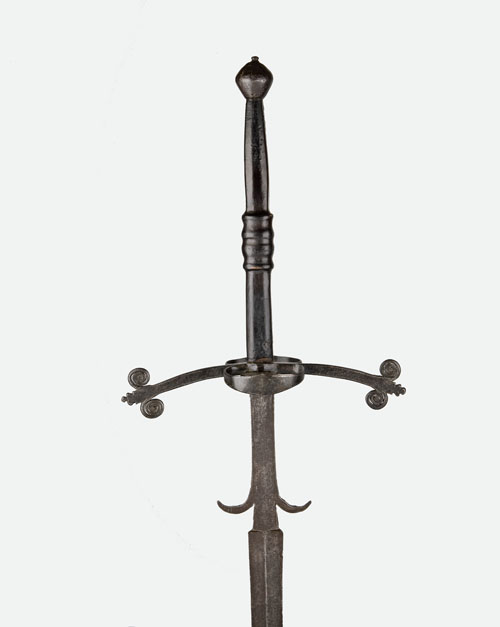 probably German or Swiss circa 1560, the massive 46in. double-edged blade of flattened diamond section terminating in a shallow spear point (some edge nicks), border line engraved long ricasso with twin hooked guards near the start of the blade edge, larged double ringed iron guard with drooping quillions finishing in double scroll terminals (possible armourer's stamp), 16in. leather bound hilt with ringed centre section, iron ball pommel (iron parts discoloured, some pitting and loss to point of blade, leather renewed in antiquity)