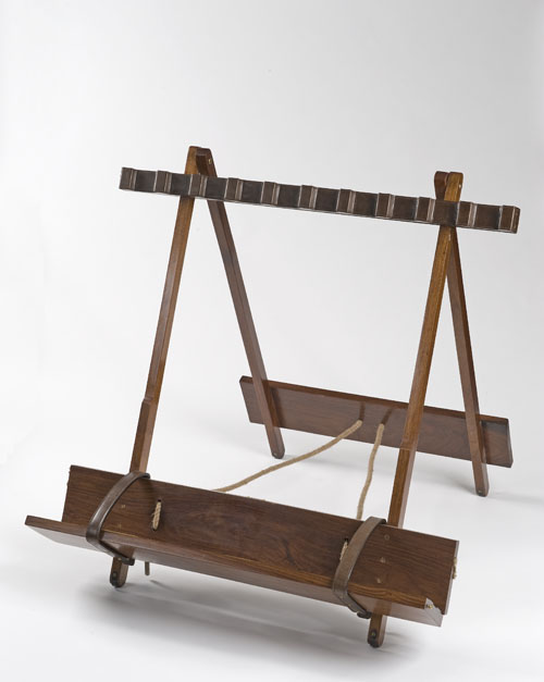 A TEAK PORTABLE FOLDING GUN RACK WITH LEATHER LINING AND BRASS MOUNTS,