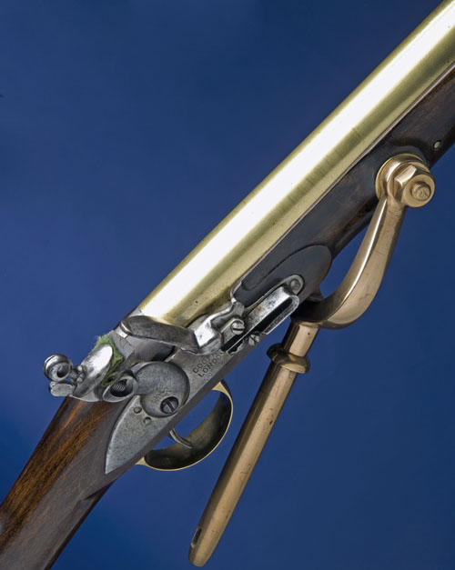 circa 1800, with heavy, round brass 24in barrel, ringed muzzle, plain military style lock marked 'COOPER LONDON' on two lines, walnut full-stock with heavy,plain brass furniture (re-stocked, cracked through rear side nail), heel-plate spur stamped with 'EXON', bronze 'horse-shoe' pintle mount bolted through swollen portion of forend and steel ramrod (replacement)