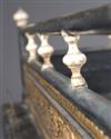 the overall dimensions 57 x 31 x 29in. approx., the yoke and framework of teak with applied gilt to filigree and wicker-work paneling, the fiddle rail with turned ivory uprights and shoulders, some evidence of historic repairs.