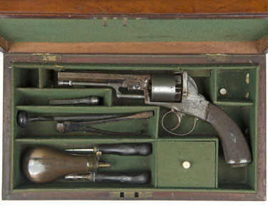 circa 1850, with 5in sighted octagonal barrel, top flat signed 'JAMES HARPER, MAKER', decorated muzzle, hinged under-barrel rammer, unfluted cylinder with border engraving to the front edge, open, border line and scroll engraved frame, scroll engraved double-action only hammer, two-piece finely chequered walnut grips, engraved butt-cap (the whole with traces of original finish), TOGETHER WITH a period mahogany, compartmented case lined in green baize and with a comprehensive selection of accessories including a bag-shaped powder flask, ball mould and turnscrew