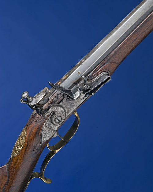 circa 1700, with re-blued two-stage 42in barrel, swamped at the muzzle, inlaid silver 'star' foresight, breech block with gold inlaid Spanish barrel-makers mark, inlaid gold poincon with a bird at rest and six further gold inlaid barrel-makers quality marks, border engraved top tang with a mask and scrolls, flat, curved, step-tailed lock plate engraved with makers name surrounded by scrolls, martial trophy to the tail, relief engraved hammer and frizzen, figured walnut half-stock with relief carved borders surrounding the furniture, fancy inlet gilt, crowned, martial trophy surrounding a Romanesque bust to the wrist, fancy carved and raised cheek-piece to the left hand side of the swollen butt, substantial fancy engraved gilt heel plate, fancy pierced sideplate with scrolls and mythical beasts, fancy gilded trigger guard with finger spur, gilt forend cap, gilt ramrod pipes and throat, button type sling mount to the butt and swivel to the forend and horn-tipped ramrod (some old inlet filling repairs to stock, majority of original gilt remaining)