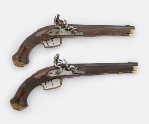 probably Russian circa 1795, with blued octagonal 7 3/4in sighted barrels, silver foresights, notched rearsights on the tang, numbered '1' and '2' in gold on the top flat, gold inlaid ball decoration to breech ends, flat, mirror-finished locks with rain-proof pans and roller frizzens, figured walnut full-stocks, carved in relief around the furniture and tangs, fancy relief carving to the wrist, finely chequered swollen butts with silver-banded mother-of-pearl escutcheons, brass engraved butt-caps bordered by fancy silver wire-work, fancy brass, engraved sideplates, fancy brass-pillared triggerguards and finials, double set triggers, fancy brass ramrod throat, ivory forend tips and original ivory tipped ebony rammers, both pistols retaining a good amount of their original finish