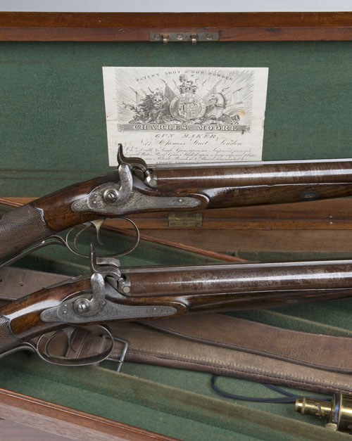 circa 1840, with browned 28in twist steel barrels, signed on the ribs 'C MOORE, 77 ST JAMES'S STREET, LONDON, MAKER TO THE LATE KING' in script and banners, shell and scrolls engraved to breech ends, scroll engraved top tangs, platinum vents, narrow, isolated bar-action fancy border engraved locks signed 'C. MOORE'S PATENT' and engraved with scrolls, scroll engraved hammers, figured walnut half-stocks (number 2208 cracked in antiquity behind lock, number 2209 old repair to forend), chequered at the wrist, silver shield escutcheons behind top tangs engraved with Roman temples and tusks, steel heel plates with engraved spurs, trigger guard tang 'squeeze' safeties, engraved and marked 'SAFETY', rope-twist border engraved trigger guard bows with scroll infill, fancy finial and ramrod throats, both guns retaining their original ramrods and traces of colour TOGETHER WITH their two tiered mahogany, baize lined compartmented case, trade label to the lid and including an 'Irish' style twin nozzle shot flask signed 'DIXON & SONS PATENT' and a 'James Dixon' adjustable powder flask